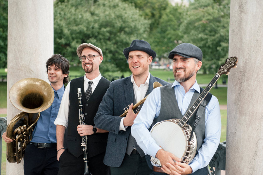 The group features a classic lineup of trumpet, clarinet, banjo, and tuba, performing a mix of traditional standards, original works, and inventive jazz takes on contemporary tunes.