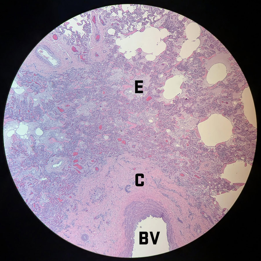 A microscopic image of tissue from the whale’s lung shows evidence of edema (E) where fluid has leaked out of small blood vessels from blood backing up in the lungs. Increased collagen (C) has formed around pulmonary blood vessels (BV). Photo by Jens Odegaard/Oregon State University.
