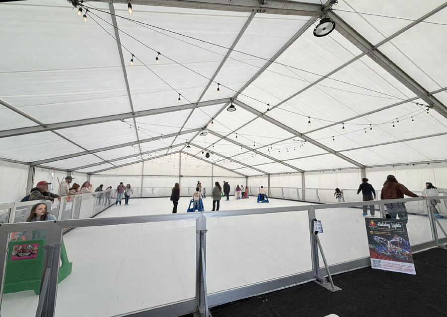 Now the facility features a 3,250-square-foot synthetic Xtraice surface housed within a 5,000-square-foot tent. The structure is shielded from coastal winds by surrounding buildings, allowing skating to continue regardless of weather. Seating is available for spectators, who are encouraged to dress warmly due to the cold environment inside the tent.