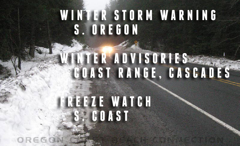 (Rockaway Beach, Oregon) – A large chunk of northwest Oregon and southwest Washington are under winter weather advisories and cautionary messages about driving conditions through higher elevations. Much of southern Oregon is under this as well, although many areas there are under a sterner winter storm warning. Meanwhile a fair amount of the southern Oregon coast is under a freeze watch.
