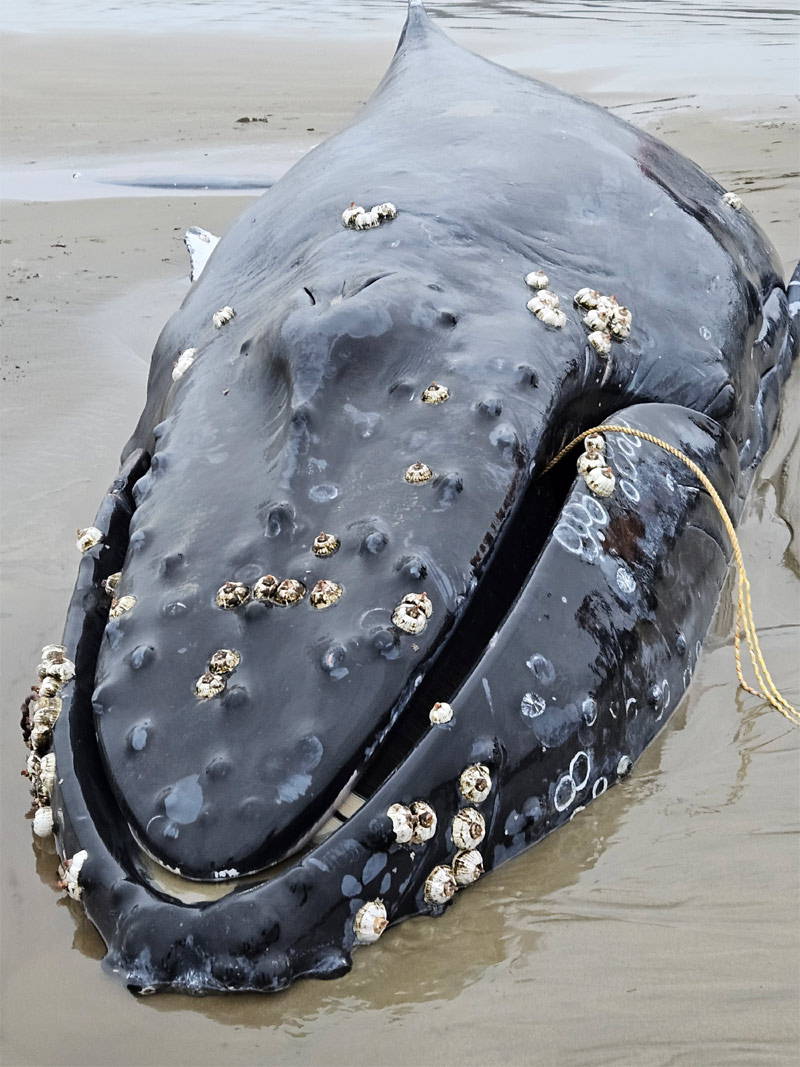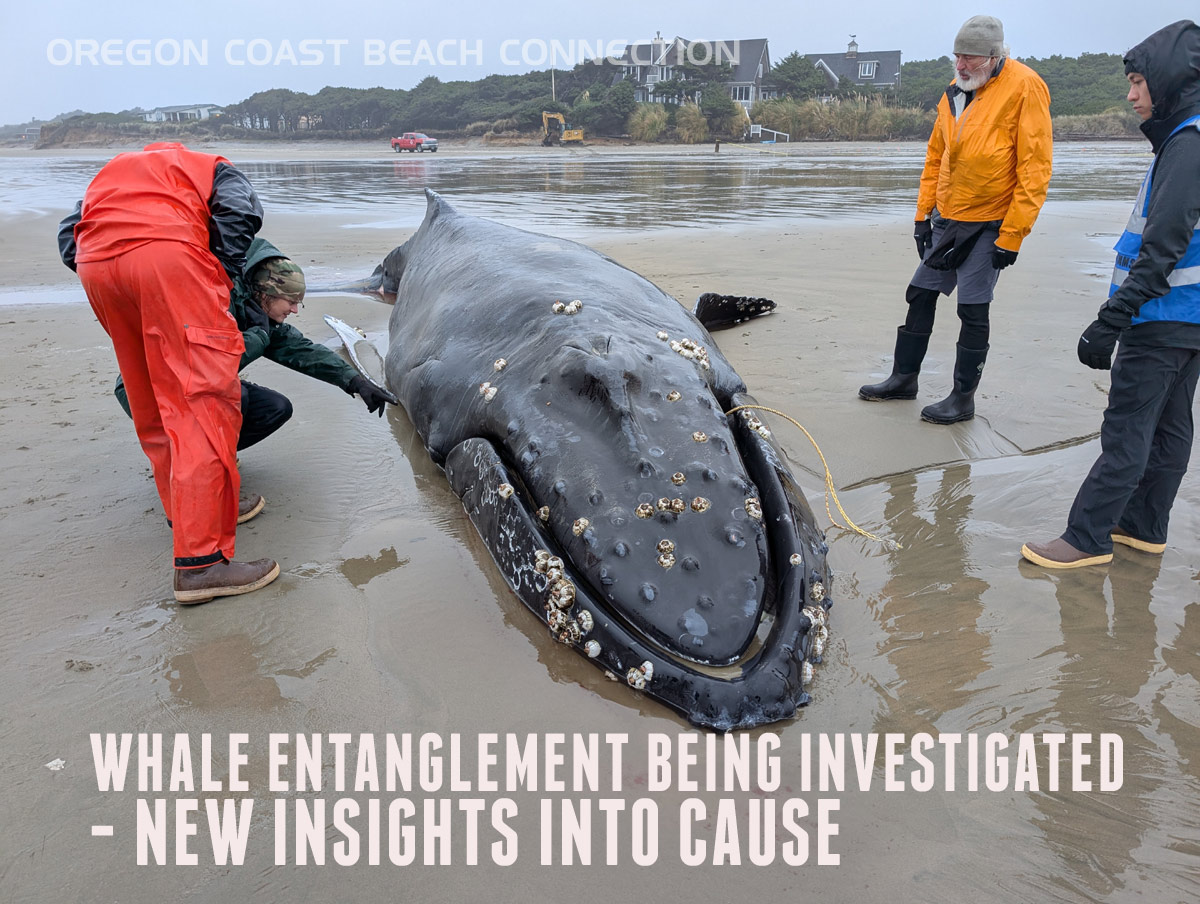 (Newport, Oregon) - The Oregon Department of Fish and Wildlife is assisting in the investigation of a juvenile humpback whale that became entangled and stranded earlier this week near Yachats. The investigation includes the National Oceanographic and Atmospheric Administration (NOAA) and its Fisheries department (known as NOAA Fisheries). (Photo of the Yachats whale courtesy Washington Coast Marine Mammal Stranding Network)