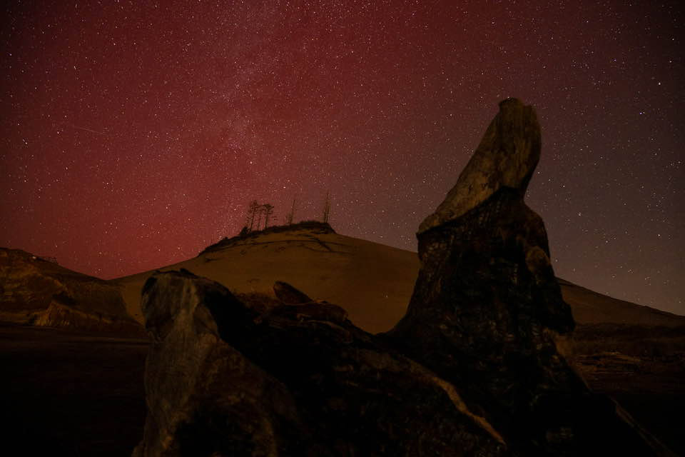 (Pacific City, Oregon) – There were times it was visible to the human eye this far south into Oregon. In pure science terms: it reached a Kp index of 8, which is about as high as that wildly colorful display back in May 2024. Indeed, it was the highest solar radiation storm in more than thirty years – since 1991. (Photo Pilar French - Cape Kiwanda looks like Mars)