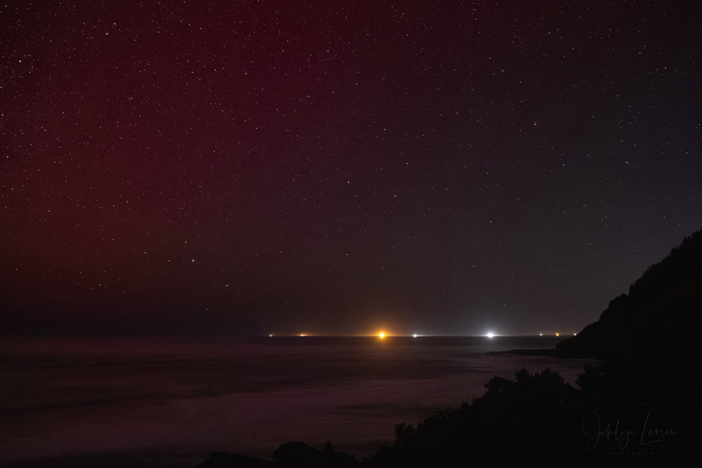 In the same set, she caught fishing boat lights and the northern lights from Cape Perpetua as well as a bit farther south towards Florence.