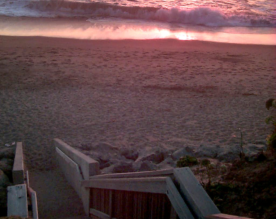 The #51C access (given that moniker by the emergency numbered sign in yellow) begins by that little paved pathway downward. Then you come to the beach opening itself, standing on a wooden platform and stairway with a wee bench, all of which gaze out on the sloped expanse of Lincoln Beach. Down the stairway a couple dozen feet and you hit the sands, which provide only a small bit of shoreline between the tides and the cliff face.