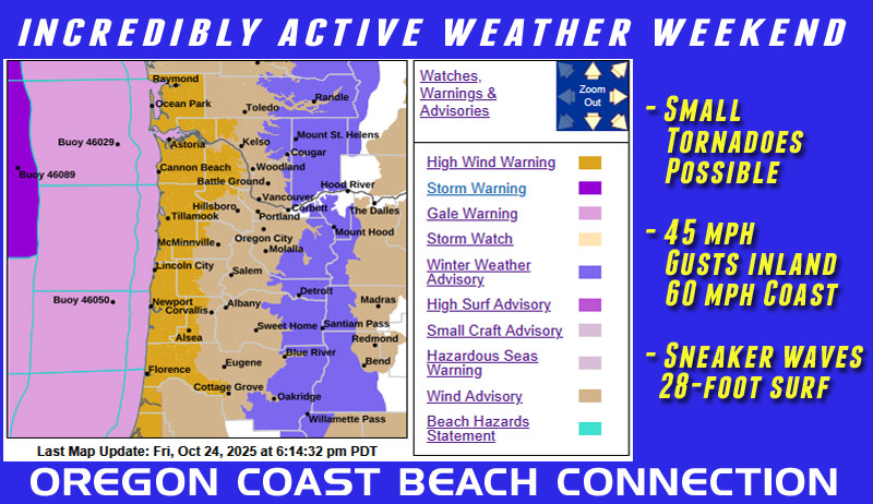 A Beach Hazards Statement remains in effect until 11 p.m. Friday for the northern half of the Oregon coast and most of the Washington coast, with forecasters warning of possible sneaker waves. A separate High Surf Advisory is now in effect from noon Saturday through 5 a.m. Sunday for the same region, where breakers up to 28 feet are expected to create hazardous surf conditions.