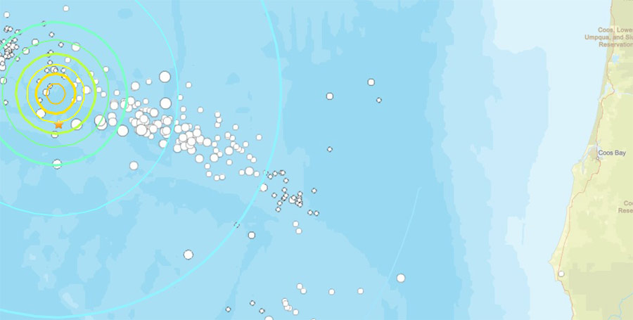 (Bandon, Oregon) - A magnitude 6.0 quake struck off the southern Oregon coast Thursday evening about 7:30 p.m. This one was larger than the usual M 4.0 and below the area usually gets, although quakes in this region are frequent. It was far from any population center and no tsunami was expected. (Graphic: USGS)