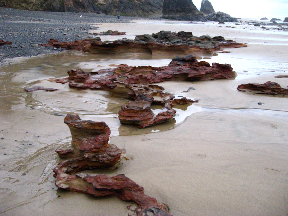 Seaside geologist Tom Horning explains that the “red towers” are essentially beach sand bonded by red iron oxide, formed beneath layers of sand.