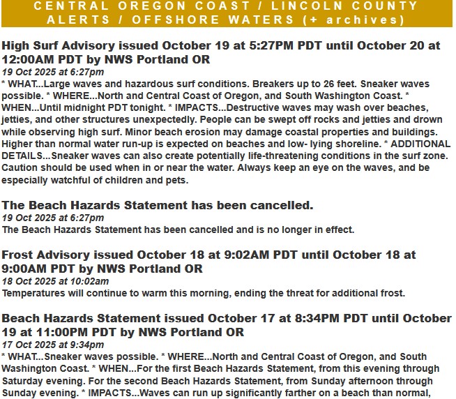 The National Weather Service (NWS) had issued a variety of alerts on the Washington and Oregon coast for the weekend. A beach hazards statement about increased risk for sneaker waves expired earlier today but was immediately replaced by a high surf advisory, warning that breakers up to 26 feet could hit beach areas from Long Beach down through Brookings.