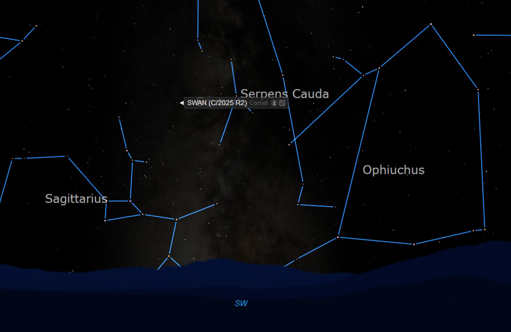 “Near the western horizon after sunset and slightly easier to see in binoculars from the southern hemisphere, this comet SWAN will pass near Zubenelgenubi, alpha star of Libra, on October 2. C/2025 R2 (SWAN) is scheduled to make its closest approach to our fair planet around October 20,” said NASA.