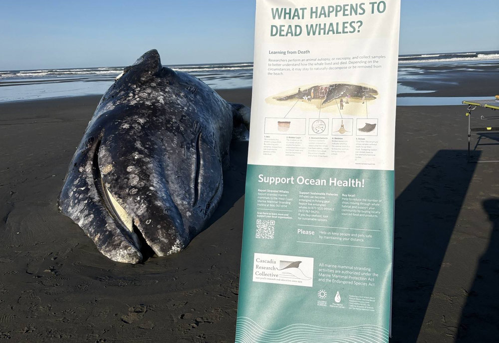 Ocean Shores saw an unusual surge of activity after two dead gray whales washed ashore on April 3, according to Cascadia Research Collective (CRC). Both animals underwent necropsies soon after, and while full results will take time, early findings were troubling.