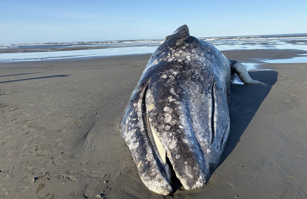“On April 4, biologists from Cascadia Research, WDFW, and SR³ - Sealife Response, Rehabilitation & Research examined the two dead gray whales that washed ashore in Ocean Shores on April 3,” said CRC. “These 42 ft adults, one male and one female, were both malnourished. The male also had significant trauma to the head, consistent with ship strike. The female was not lactating and would not have been nursing a calf.”