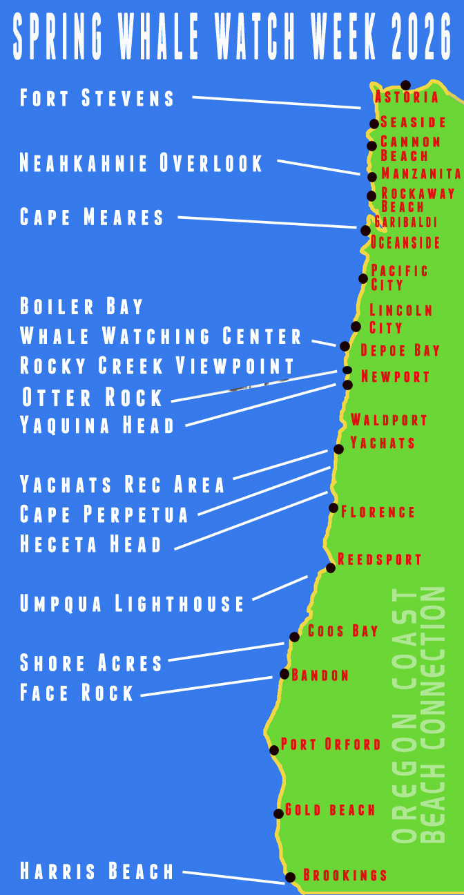 A map of all volunteer-staffed viewing sites is available on the official event webpage at oregonstateparks.org. Also see Oregon Coast Whales for constant updates on whale news and whale watching in the area.
