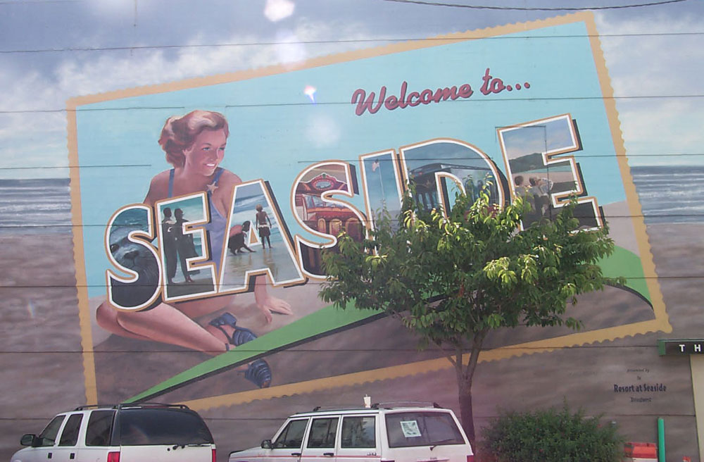 The backside of one of the major buildings in Seaside, part of the "Million Dollar Walk" known as Broadway. This is no longer there - taken down in 2018 when a brewpub went in. However, there are other walls in Seaside with this mural but they're not as gigantic.